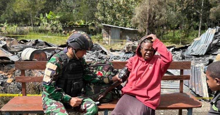 Lanny Jaya, - Pasca musibah kebakaran yang melanda permukiman warga di Desa Nombome, Satgas Yonif 511/DY bergerak cepat memberikan bantuan kemanusiaan berupa layanan pengobatan bagi masyarakat terdampak.
